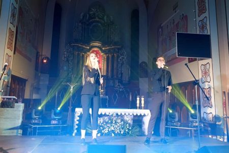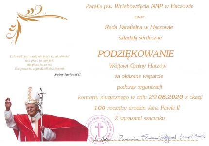 W sobotę 29 sierpnia w Sanktuarium Matki Bożej Bolesnej w Haczowie odbył się niezwykły koncert przygotowany z okazji 100-lecia urodzin Jana Pawła II, będący słowno-muzyczną podróżą jego śladami. Organizatorami koncertu była Parafia Haczów oraz Rada Parafialna w Haczowie, a patronat nad wydarzeniem objęli Ks. Adam Zaremba Proboszcz Parafii w Haczowie, Stanisław Jakiel Wójt Gminy Haczów, Zbigniew Sieniawski Radny Rady Gminy Haczów i członek Rady Parafialnej w Haczowie. Koncert prowadzili Anna Hejnar i Sebastian Jakubczyk, którzy pomiędzy utworami przypominali sylwetkę Świętego i najważniejsze wartości, którymi się kierował, odnoszące się do godności człowieka, prawdy, sprawiedliwości i szacunku względem siebie. Koncert rozpoczął się od wysłuchania przepięknego utworu „Nieśmiertelności nie odbierze nam Bóg „ Piotra Rubika w wykonaniu Marty Bober oraz Klaudii Graboń. Tego wieczoru mogliśmy usłyszeć „Modlitwę” Krzysztofa Antkowiaka, którą zaśpiewał Dawid Wojtoń. Dawid przeniósł nas w także w trudne czasy „Solidarności” utworem „Arahja”. Utwory „Nie zastąpi Ciebie nikt” i Hymn Światowych Dni Młodzieży z 2016 roku „Błogosławieni” wykonała Magdalena Folta. Kacper Malinowski zaśpiewał utwór z repertuaru Czerwonych Gitar „Biały Krzyż” oraz „Nauczmy się żyć obok siebie”. Aleksandra Dyszkowska zachwyciła wszystkich utworem „Wracam do domu” Justyny Steczkowskiej oraz jedną z ulubionych pieśni Ojca Świętego „Jest taki kraj”, podobnie jak Aneta Aszlar wykonując piosenkę Jacka Wójcickiego „Miejcie nadzieję”, czy „Panie” Michała Bajora. We wspaniałym wykonaniu duetów Karoliny Czapor i Nikodema Szmyda usłyszeliśmy „Magnificat” i „Leć muzyczko”, a dziewczyny, które zaczynały koncert Marta i Klaudia zaśpiewały „Jakie piękne jest imię Twe”. Na zakończenie soliści wraz z obecnymi na koncercie dziećmi pożegnali słuchaczy wspólnie wykonanym utworem „Walc o życiu”.