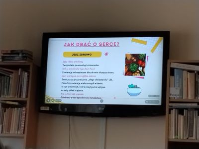 Następnie odbyła się prezentacja multimedialna na temat profilaktyki chorób serca. Omówiono, jakie czynniki sprzyjają zachowaniu zdrowego serca, a także co może prowadzić do chorób układu sercowo – naczyniowego. Szczególną uwagę zwrócono na znaczenie zdrowej diety, aktywności fizycznej, unikanie stresu oraz regularnych badań lekarskich. Uczniowie dowiedzieli się również jakie są najczęstsze czynniki ryzyka chorób serca takie jak nadwaga, brak ruchu czy niezdrowe odżywianie.