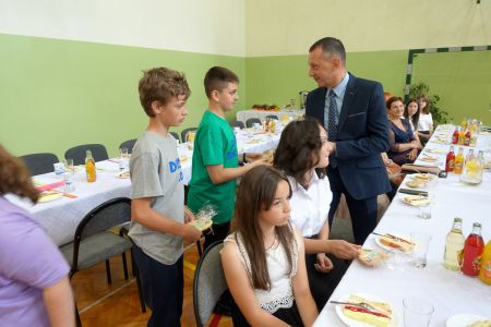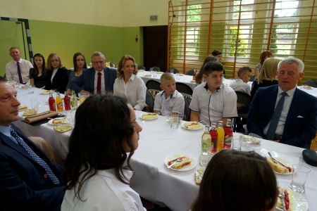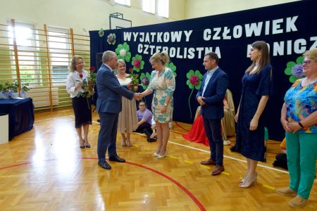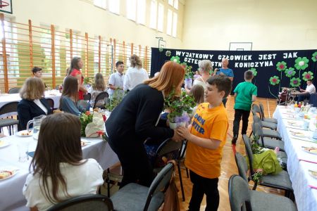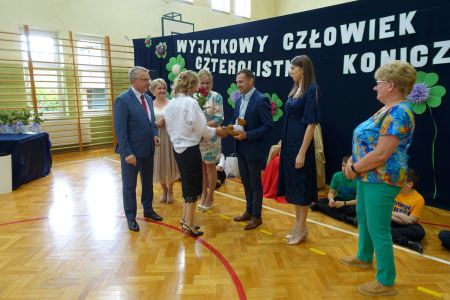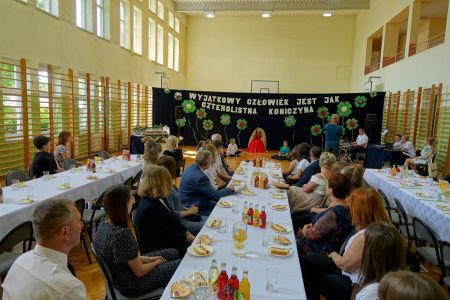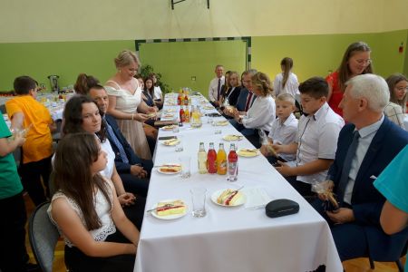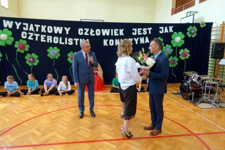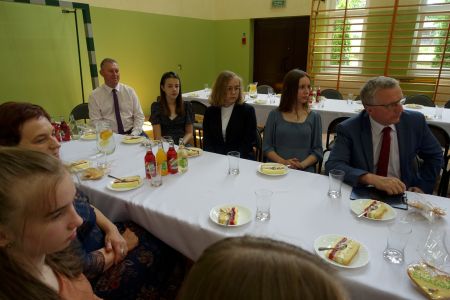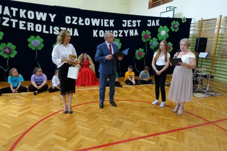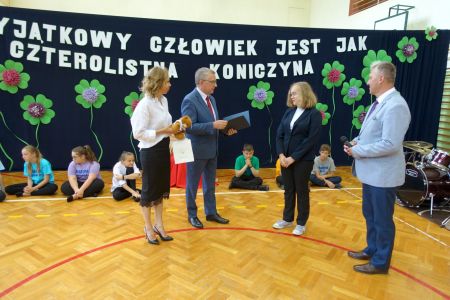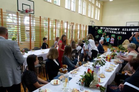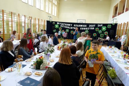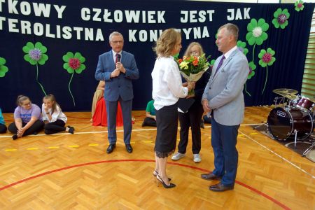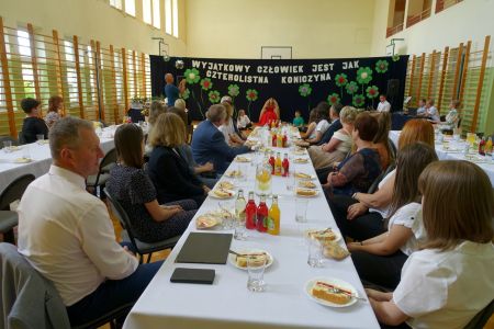 Po części oficjalnej wszyscy uczestnicy spotkania zostali ugoszczeni. Na pożegnanie zaś Dyrektorzy szkół oraz Pan Wójt i Pani Kierownik SAPO otrzymali wyhodowane przez P. Dorotę Ladzińską czterolistne koniczyny.