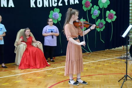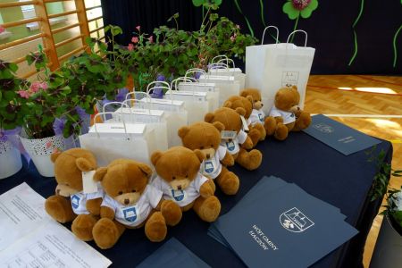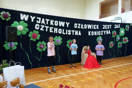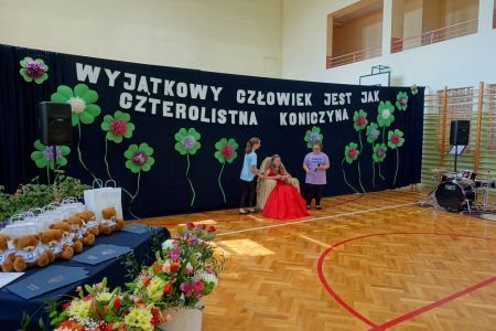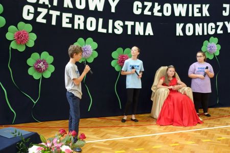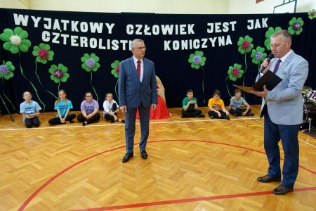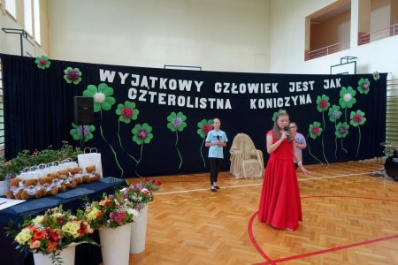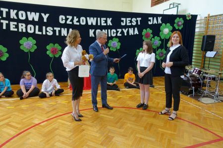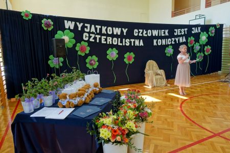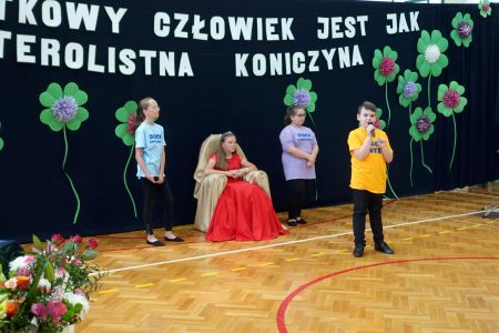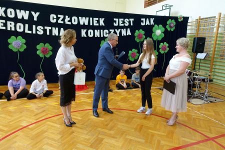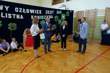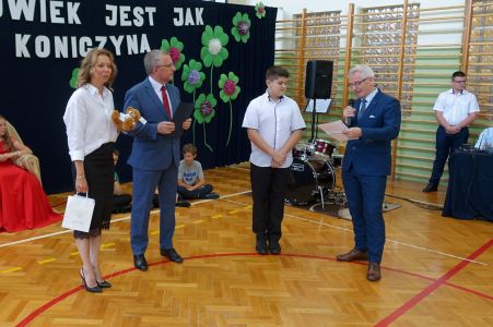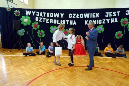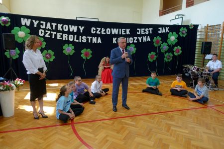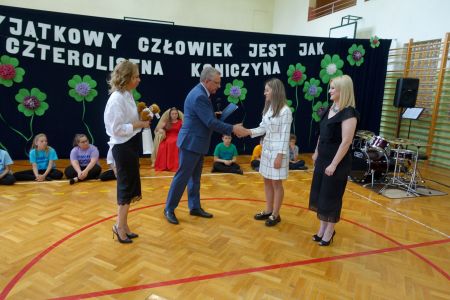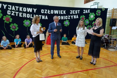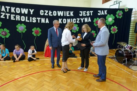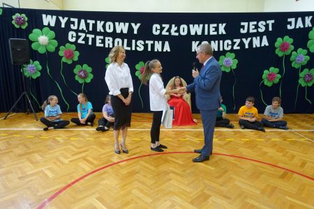 „Nie ma dla gospodarza większej satysfakcji, niż widzieć dom wypełniony zacnymi i przyjaznymi gośćmi” – tymi słowami przywitała Pani Dyrektor Joanna Kaczor wyjątkowych gości, którzy przybyli na uroczystość rozdania nagród Wójta Gminy Haczów do SP im. gen. B. Prugara – Ketlinga w Trześniowie. Uczniowie tej placówki pod kierunkiem nauczycieli humanistów przygotowali i zaprezentowali montaż słowno-muzyczny w baśniowej konwencji opierającej się na dyspucie Królowej Szkoły i towarzyszących jej Duchów Opiekuńczych o tym, co można by było ofiarować w prezencie najlepszym uczniom naszej gminy. Przedstawieniu tego, co w życiu każdego młodego człowieka powinno być istotne, towarzyszyły występy wyjątkowych uczniów prezentujących swe talenty: muzyczne, taneczne, sportowe i kulinarne. Królowa Szkoły, godząc ostatecznie poróżnione Duchy Opiekuńcze Szkoły, stwierdziła, że każdy podarunek, który noszą w sercu przyda się młodym ludziom w życiu. Dlatego też najlepsi uczniowie z każdej szkoły oraz ich dyrektorzy otrzymali w darze symboliczne serca z nazwą ponadczasowej wartości: sport, ekologia, nauki ścisłe, kultura, dobroć.