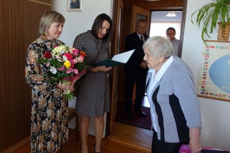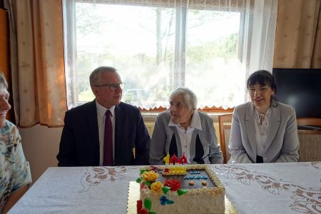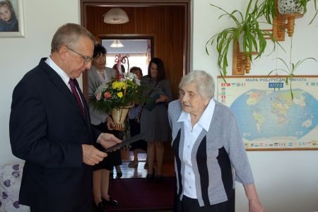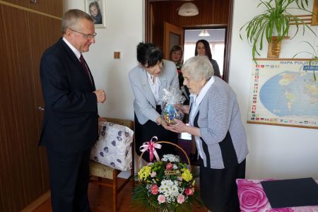 Z życzeniami od władz samorządowych przybyli Wójt Gminy Haczów Stanisław Jakiel i Kierownik Urzędu Stanu Cywilnego w Haczowie Małgorzata Nowicka. Gratulacje złożyli również przedstawiciele Kasy Rolniczego Ubezpieczenia Społecznego przekazując list gratulacyjny z informacją o dodatku specjalnym przeznaczonym dla osób uprawnionych do emerytury rolniczej, którzy ukończyli 100 lat.