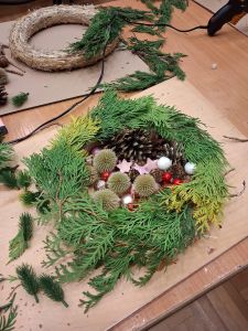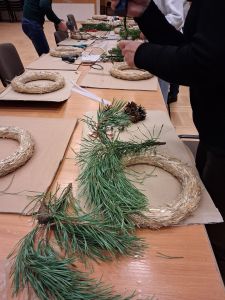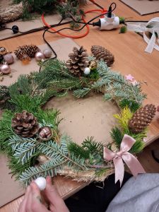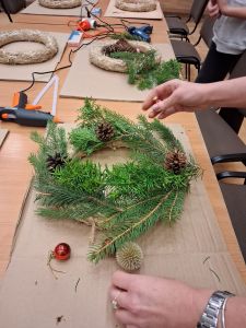 Podczas około dwugodzinnego spotkania uczestnicy mieli okazję własnoręcznie wykonać dekoracyjne wianki z wykorzystaniem różnorodnych materiałów oraz świątecznych ozdób. Zajęcia przebiegły w twórczej i przyjaznej atmosferze, a każdy z uczestników zakończył warsztaty z estetyczną, samodzielnie przygotowaną kompozycją.