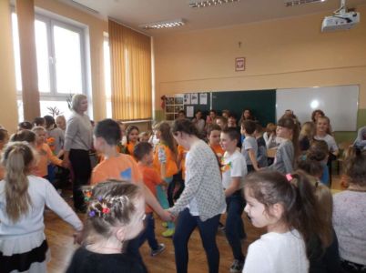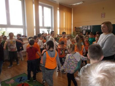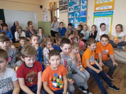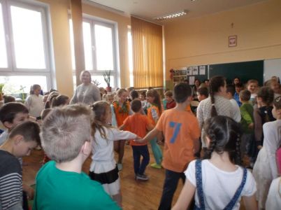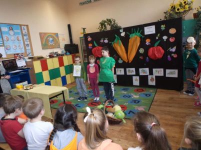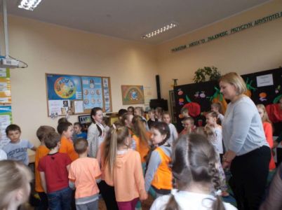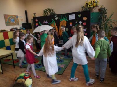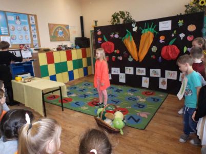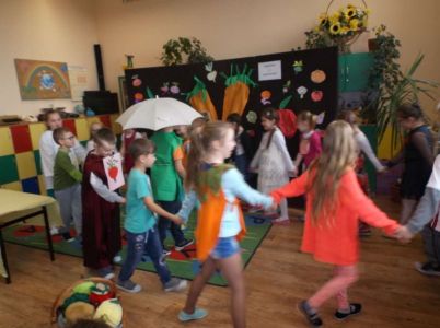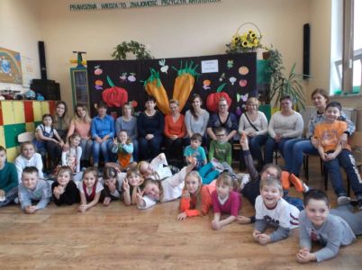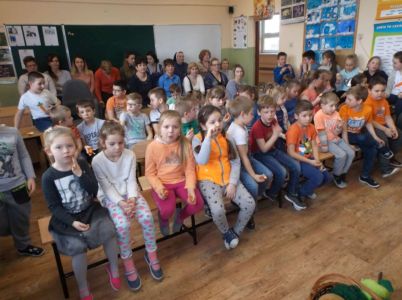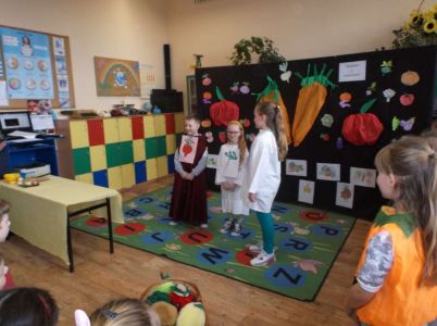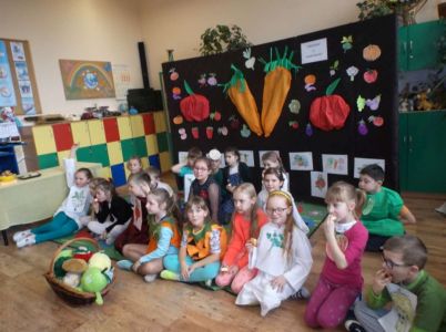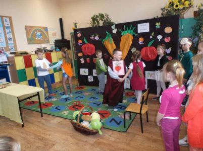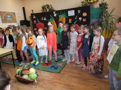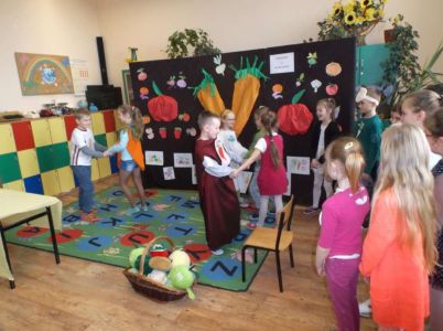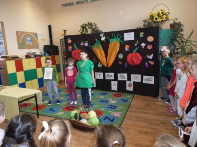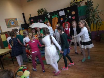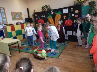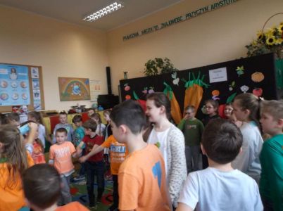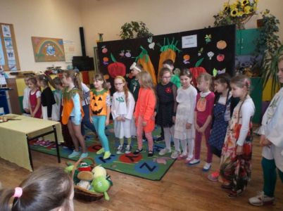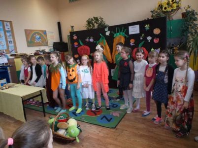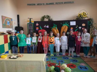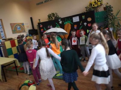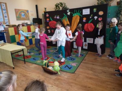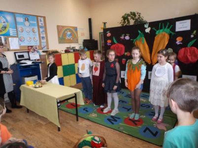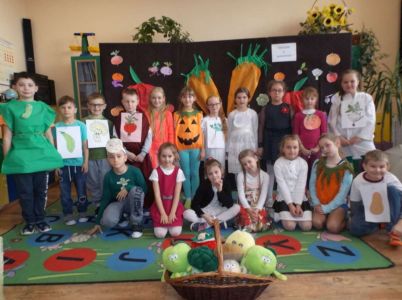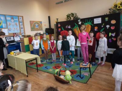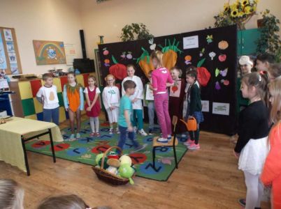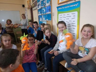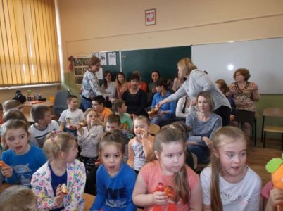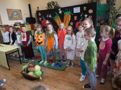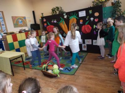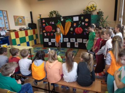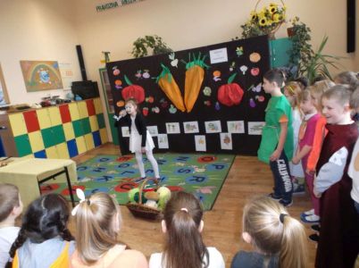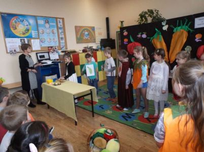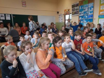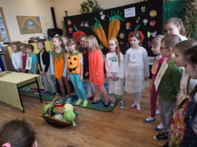 Dzieci z klasy II SP realizowały kolejne zadanie w ramach Ogólnopolskiego Projektu „Zdrowo jem, więcej wiem”. Tym razem przedstawiły zgromadzonym licznie gościom Teatrzyk Warzyw „Urodziny u marchewki”. W wesołych wierszach i skocznych piosenkach zachęcały do zdrowego odżywiania się i codziennego przyjmowania odpowiedniej porcji witamin. Po części artystycznej nastąpiła konsumpcja marchewek i jabłek. Dzieci bardzo aktywnie uczestniczyły w dyskusji na temat zdrowego odżywiania. Chętnie wzięły udział we wspólnej zabawie. Wspaniałe mamy uczniów klasy II, które od początku trwania projektu aktywnie uczestniczą w jego realizacji, nie zawiodły i tym razem. Gromko oklaskiwały występy swoich dzieci i chętnie uczestniczyły w dyskusji i wspólnej zabawie. Podzieliły się także wiadomościami zdobytymi na Forum dla rodziców „Twoje własne H2O” zachęcając dzieci do aktywnego trybu życia. Zachęcały do picia wody mineralnej i wskazywały na szkodliwe działanie składników znajdujących się w takich napojach jak pepsi, coca cola, tiger czy też innych sztucznie barwionych napojów.