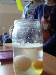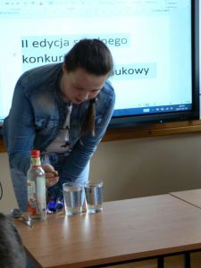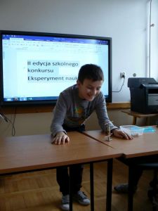 Uczniowie przed licznie zgromadzoną widownią zaprezentowali wykonane przez siebie doświadczenia pokazowe z dziedziny fizyki i chemii. Można było zobaczyć między innymi: działający „czynny wulkan”’, mieszanie się barwników w mleku i ich rozdzielanie , skaczące jajko poddane kąpieli w occie, nurka Kartezjusza oraz piłeczkę podtrzymywaną przez podmuch powietrza z suszarki.