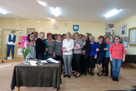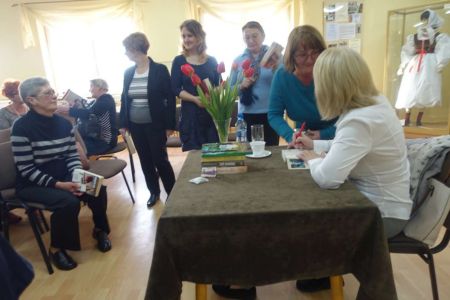 Literacka działalność Magdaleny Zimny zaczęła się od uczestnictwa w ogólnopolskim konkursie „Pisz do Pilcha”, gdzie sam Mistrz wybrał jej opowiadanie pt. „Studnia” do druku. To był jej literacki debiut, po napisaniu którego wyjechała do Anglii i na pewien czas porzuciła działalność literacką. Pani Magdalena to nie tylko utalentowana pisarka, ale przede wszystkim wspaniała, i pełna wdzięku kobieta. Z radością wspominała, że pierwszą powieść –„Ślady hamowania,” pisała „na kolanie”, a mimo to, udało jej się stworzyć dzieło, które zostało wyróżnione w konkursie „Świat Kobiety”. Najbardziej znana powieść pisarki - „Pola” – otrzymała nagrodę na Festiwalu Literatury „Pióro i pazur”. Pisarka nadmieniła, że często spotyka się z opinią, że jest to „historia silnych kobiet” albo „opowieść o pięknie życia w godzinie śmierci”. W 2014 r. autorka wydała książkę, podsumowującą lata pracy dla sądownictwa i Policji brytyjskiej, zatytułowaną „Kilka przypadków szczęśliwych”. Najwięcej czasu poświęciła na relację z przebiegu pisania powieści pt. „Zaginione”, w której rzeczywistość polska lat osiemdziesiątych XX wieku przeplata się z krajobrazami, historią i świętymi miejscami Armenii. Ta powieść ma dla niej szczególne znaczenie, ponieważ podczas pobytu w Armenii zakochała się w tym maleńkim zakątku świata i chętnie wraca do wspomnień z nim związanych. Trafnie połączyła losy bohaterów powieści z problemami życia codziennego Ormian dla których, jak sama zauważa czas, zatrzymał się. Wrodzone poczucie humoru Pani Magdaleny sprawiło, że słuchacze swobodnie rozmawiali i z lubością wspominali studenckie czasy na tle miejsc i wydarzeń w Rzeszowie, z którymi pisarka jest szczególnie związana z racji swojego pochodzenia. Pod koniec uroczystości autorka chętnie rozdawała swoje autografy, rozmawiając przy tym swobodnie z czytelnikami. Opowiedziała również o swoich planach na przyszłość, pracuje bowiem nad wydaniem zbioru reportaży, na które czekamy z niecierpliwością. Dziękujemy wszystkim uczestnikom za tak liczne przybycie i za wspólnie spędzony czas, który na długo zachowamy w pamięci. Słowa podziękowania kierujemy również do Pani Małgorzaty Augustyn, wojewódzkiego koordynatora DKK, która zawsze służy nam swoją pomocą i wspiera cennymi radami.