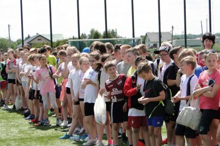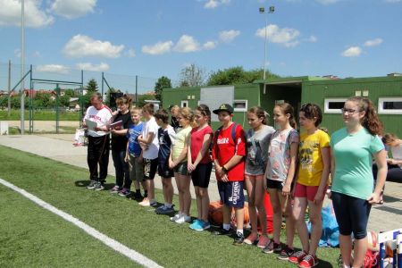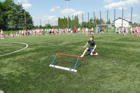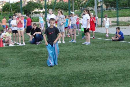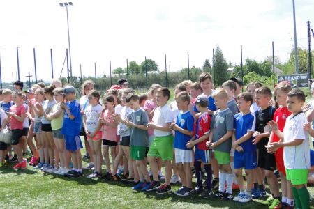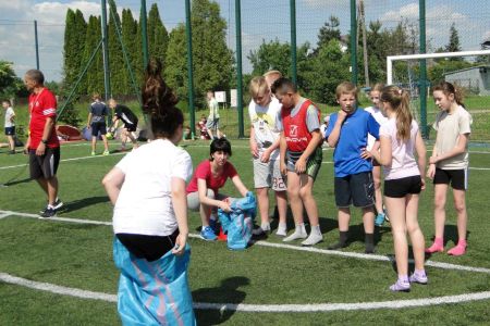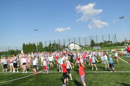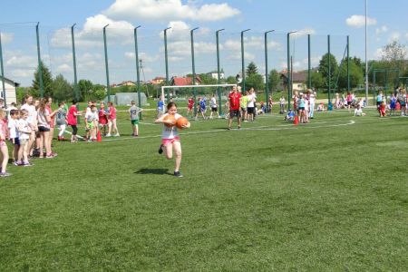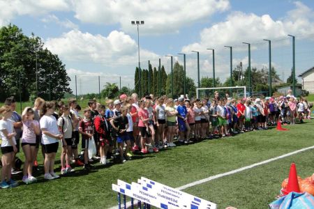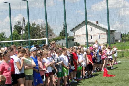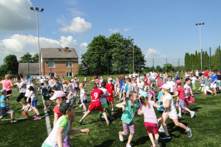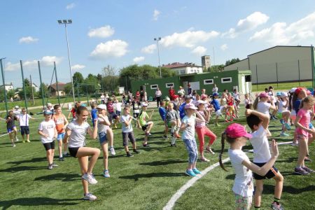 O godz. 8.00 wychowawcy spotkali się ze swoimi klasami i rozdali im upominki przygotowane przez Radę Rodziców. Następnie wszyscy uczniowie i nauczyciele zebrali się na boisku „Orlik”. Po rozgrzewce przeprowadzonej przez p. Martę Sobotę do znanych i lubianych melodii rozpoczęły się rozgrywki sportowe w dwu kategoriach wiekowych: klasy I – III i klasy IV – VI. Wszystkie klasy rywalizowały w pięciu konkurencjach, przygotowanych przez p. Piotra Ekierta: tor przeszkód z płotkami, bieg w workach, bieg z dwiema piłkami, bieg z przewlekaniem szarfy oraz rzut do ruchomego celu; klasy IV – VI walczyły dodatkowo w sztafecie szybkościowej z pałeczką sztafetową.