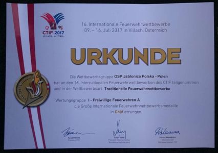 W dniach 9-16 lipca w miejscowości Villach w Austrii odbyły się Międzynarodowe Zawody Sportowo-Pożarnicze CTIF. Olimpiada odbywa się co 4 lata. Jedną z pięciu drużyn reprezentujących nasz kraj w grupie A była nasza męska drużyna, dla której był to debiut na tego typu zawodach. Zawodnicy wywalczyli sobie awans zajmując 5 miejsce na ubiegłorocznych Mistrzostwach Polski w Polanicy Zdrój.