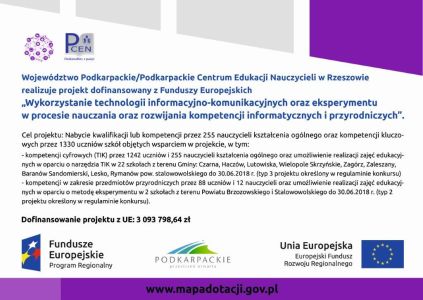 Województwo Podkarpackie/Podkarpackie Centrum Edukacji Nauczycieli w Rzeszowie realizuje projekt dofinansowany z Funduszy Europejskich „Wykorzystanie technologii informacyjno-komunikacyjnych oraz eksperymentu w procesie nauczania oraz rozwijania kompetencji informatycznych i przyrodniczych".