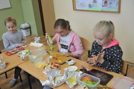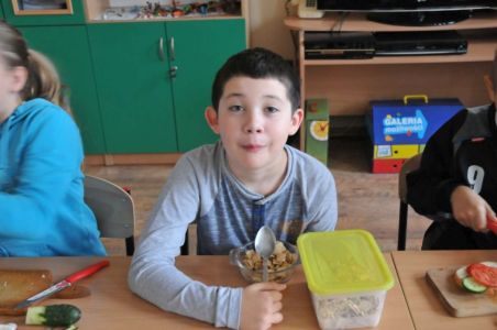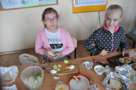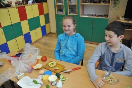 Śniadanie poprzedziliśmy zajęciami, które miały na celu uświadomienie dzieciom, jak ważne jest spożywanie rano zdrowego posiłku oraz przybliżyły najmłodszym 12 zasad zdrowego odżywiania się i utrwaliły reguły zachowania się przy stole. Dzieci z entuzjazmem uczestniczyły w podjętej akcji.