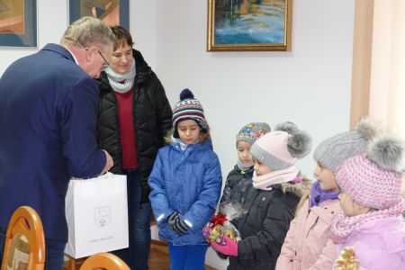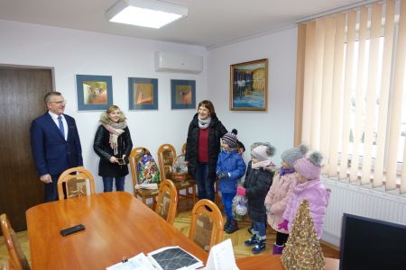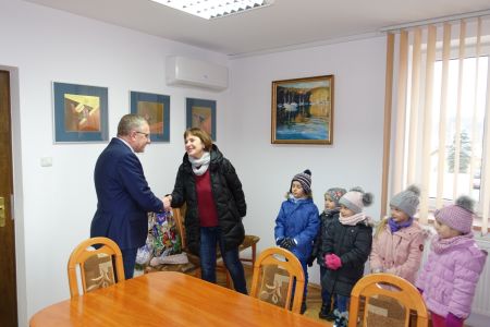 Dzieci złożyły życzenia z okazji nadchodzących Świąt Bożego Narodzenia oraz Nowego Roku. W podziękowaniu otrzymały z rąk Wójta Gminy Haczów Stanisława Jakiela drobne upominki.