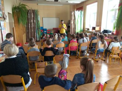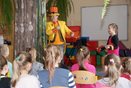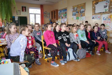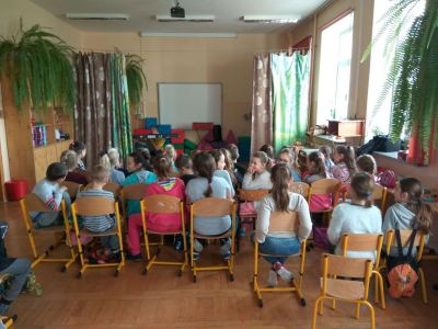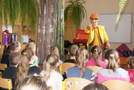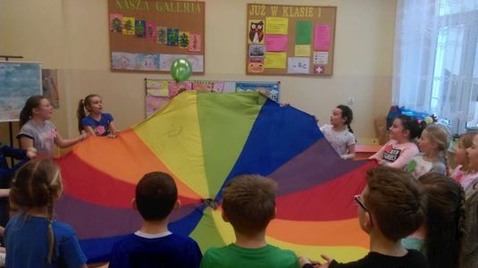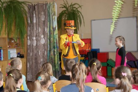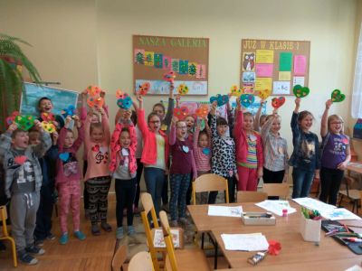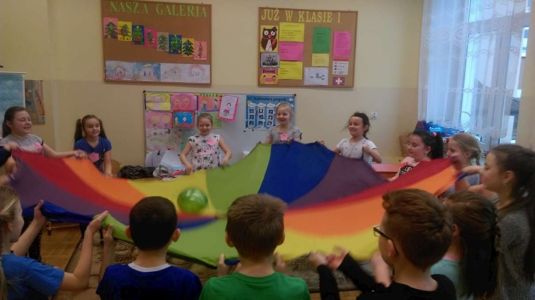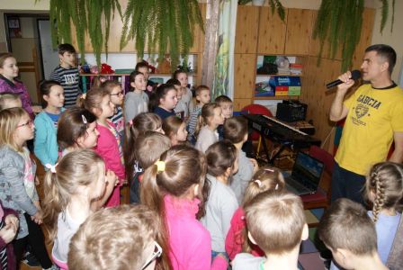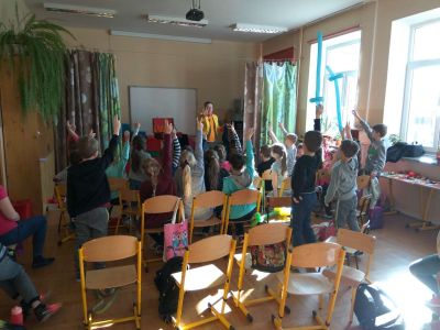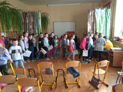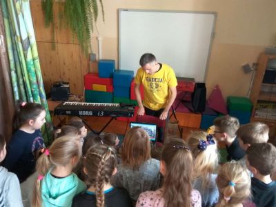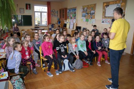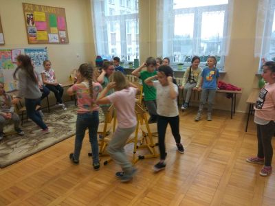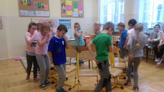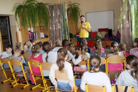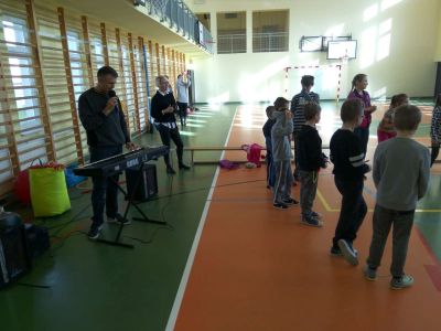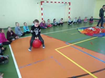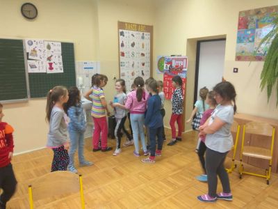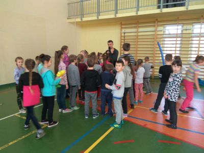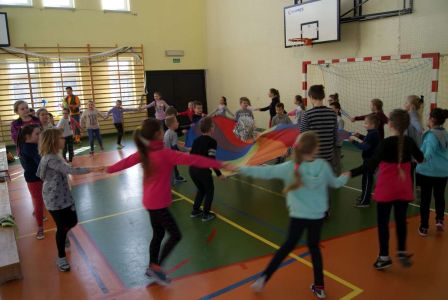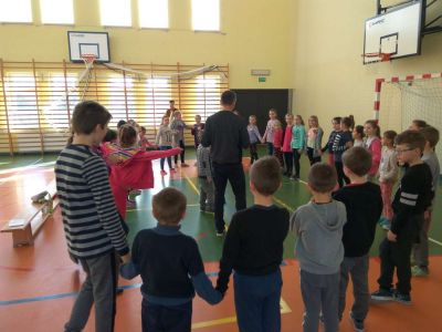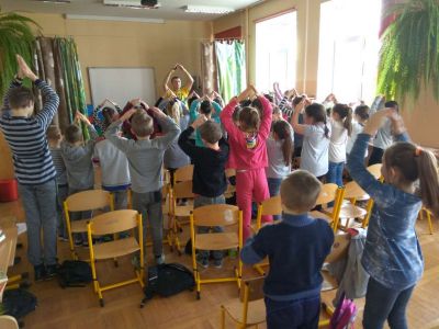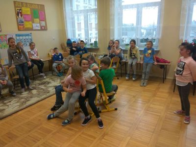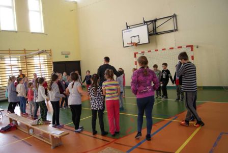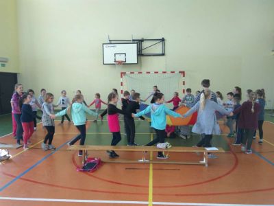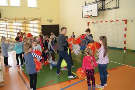 Uczniowie uczestniczyli w zajęciach ruchowo-tanecznych prowadzonych przez Urszulę Marchewkę – instruktora rytmiki w GOKiW w Haczowie, szybko uczyły się układów i kroków tanecznych.