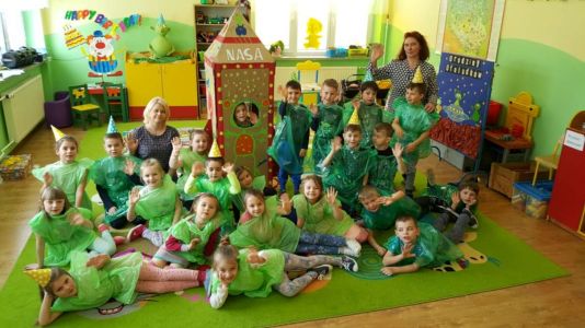 28 lutego 2018 r. odbyły się pierwsze urodziny grupy V – „Ufoludków”. Dzieci świetnie bawiły się poznając podstawowe słownictwo dotyczące urodzin i kosmosu. Jak na urodziny przystało był również słodki poczęstunek w postaci tortu (za który serdecznie dziękujemy). Wszystkie dzieci otrzymały również prezenty.