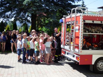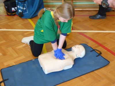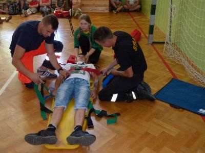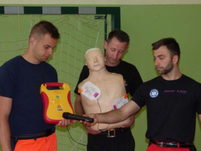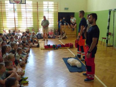 Po zakończeniu części konkursowej na dziedzińcu szkolnym odbył się pokaz sprzętu ratowniczego i gaśniczego zorganizowany przez OSP Trześniów. Licznie zgromadzeni uczniowie naszej szkoły oblegali wóz strażacki usiłując wejść w każdą jego część a nasz absolwent, obecnie strażak, Mateusz Turek cierpliwie odpowiadał na wszystkie pytania i objaśniał przeznaczenie wyposażenia wozu. Bardzo dziękujemy Mateuszowi za tę prezentacje. Następnie na sali gimnastycznej ratownicy medyczni Rafał Szmyd i Mateusz Rączka prezentowali działanie i obsługę AED czyli defibrylatora elektrycznego oraz profesjonalne badanie urazowe, układanie i przenoszenie poszkodowanego na desce ratowniczej. Pokaz cieszył się wielkim zainteresowaniem zgromadzonych, wszyscy mieli okazję zobaczyć jak działają profesjonalni ratownicy medyczni. Składamy wielkie podziękowania dla obu Panów za to, że bezinteresownie zaoferowali swoją pomoc, przywieźli fantomy i przeprowadzili dla wszystkich zgromadzonych profesjonalne szkolenie.