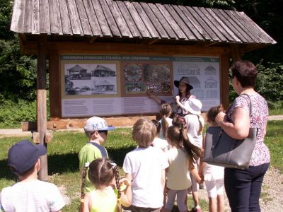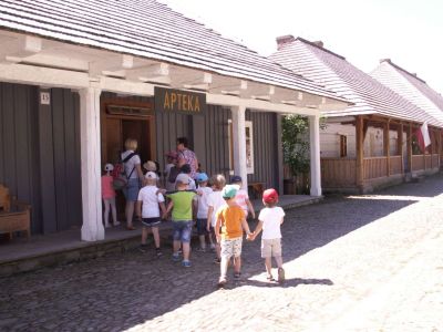 Dzieci zwiedziły m.in. Kuźnię, Kościół, chałupy i zabudowania gospodarcze, szkołę, a także Miasteczko Galicyjskie (Fryzjer, Zegarmistrz, Apteka, Sklep kolonialny, Fotograf, Poczta, Straż Pożarna, itp.)