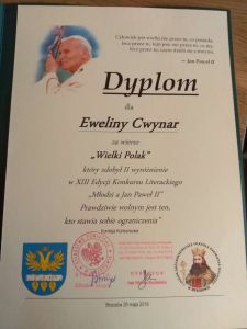 Konkurs jak co roku cieszył się dużym zainteresowaniem. Jury zapoznało się z prawie 30 pracami, spośród których wyłoniono 4 najlepsze. II Wyróżnienie zdobyła Ewelina Cwynar – uczennica kl. III gimnazjum SP w Jabłonicy Polskiej za wiersz „Wielki Polak”. Młoda poetka nawiązała w nim do ostatnich słów Jana Pawła II, encykliki o wolności i Duchu Świętym.