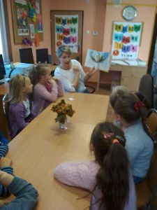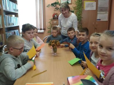 Nasi goście mogli dowiedzieć się co to jest biblioteka, czym się zajmuje i dlaczego warto chodzić do biblioteki oraz jakie warunki trzeba spełnić, aby zostać czytelnikiem. Następnie dzieci wysłuchały opowiadania Renaty Piątkowskiej pt: „Paluszki, czyli o dziesięciu takich, co nigdy się nie nudzą”. Jak sam tytuł wskazuje są to zabawne przygody i codzienne czynności paluszków głównego bohatera Marcinka. W wesoły nastrój wprowadził nas szczególnie fragment, w którym przedstawiono wiersz Joanny Kulmowej: „Gdybym miał dziesięć rąk…”. Dzieci ochoczo odpowiadały na pytania dotyczące przeczytanej treści.