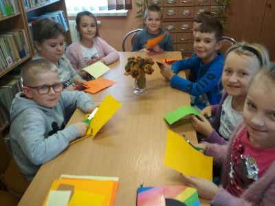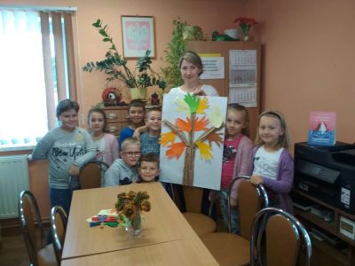 W dalszej kolejności na kolorowych kartkach papieru odrysowaliśmy nasze dłonie, a po wycięciu nakleiliśmy je na wcześniej przygotowane drzewo. W ten sposób powstało jesienne drzewko z naszymi paluszkami, które podobnie jak u bohatera książki również i u naszych małych czytelników nigdy się nie nudzą…