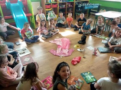W dalszej części zajęć dzieci poznały etapy powstawania książki, jak również na podstawie zgromadzonych atrybutów, odgadywały tytuły znanych bajek, np. pantofelek - "Kopciuszek", czarne kozaki - "Kot w butach", pudełko zapałek - "Dziewczynka z zapałkami" itd.