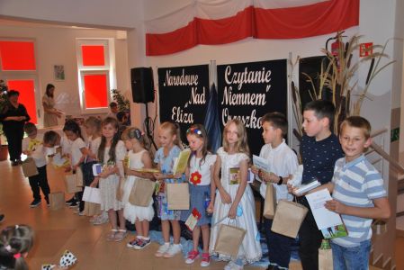 Oj, działo się, działo😊 Recytacje wierszy o rzekach (m.in. J. Brzechwy, J. Papuzińskiej, G. Koby), scenka teatralna inspirowana wierszem o rzece, głośna lektura fragmentów powieści Orzeszkowej, występ wokalny (ludowa pieśń „Ty pójdziesz górą” z ekranizacji „Nad Niemnem”) i taneczny (taniec z batonem do piosenki „Czas jak rzeka” Cz. Niemena). A do tego wspaniałe nagrody i degustacja wybornych, nadziewanych orzeszków dla wszystkich uczestników biorących udział w różnych rywalizacjach.
