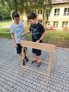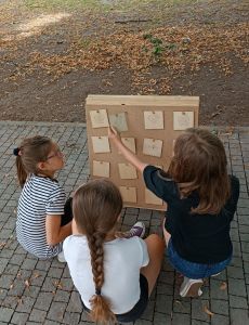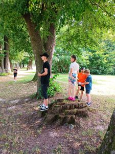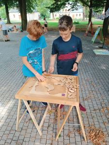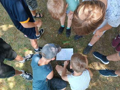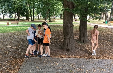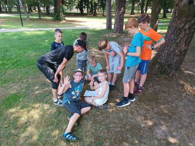 Następnie dzieci uczestniczyły w zespołowej grze terenowej w parku, szukając ukrytych przedmiotów. Zawodnicy wykonali własnoręcznie mapy dla swoich przeciwników, na terenie parku ukryli „skarby” a następnie musieli nawzajem te skarby znaleźć.