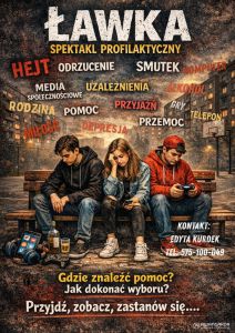 W dniu 9 marca 2026 r. w Gminnym Ośrodku Kultury i Wypoczynku w Haczowie został wystawiony spektakl „ŁAWKA”. Przedstawienie adresowane było do uczniów klas IV – VI wszystkich szkół podstawowych z terenu gminy Haczów. W sposób przystępny i bezpieczny dla dzieci sposób poruszył istotne problemy wychowawcze i społeczne, z jakimi mierzą się współcześni uczniowie: hejt i cyberprzemoc, uzależnienie od gier komputerowych oraz napojów energetycznych, presję rówieśniczą i potrzebę akceptacji, trudne relacje rodzinne, znaczenie rozmowy oraz rolę pedagoga szkolnego i osób dorosłych jako wsparcia.