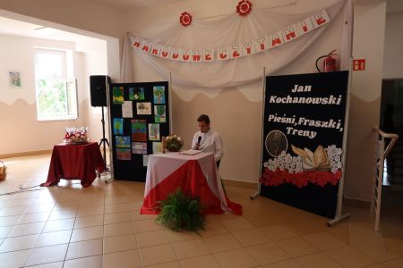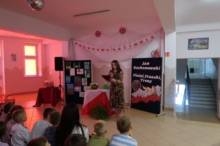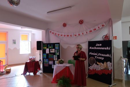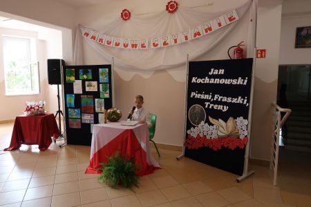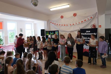 Na zaproszenie do udziału w akcji równie chętnie odpowiedzieli emerytowani nauczyciele z naszej szkoły - Panie Alina Prorok, Maria Wermińska, Krystyna Wojtoń, Jadwiga Dusza, Pani bibliotekarka – Bożena Krępulec oraz Przewodnicząca Rady Rodziców – Anna Kołodziejczyk. Wyjątkowym gościem honorowym okazał się … sam Jan Kochanowski 😊, który przemówił do zebranych dzięki zaawansowanej technologii AI.