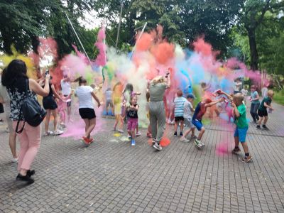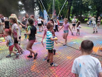 Bardzo widowiskową częścią Pikniku był FESTIWAL KOLORÓW, czyli bitwa na kolorowe proszki, która dała mnóstwo frajdy wszystkim uczestnikom. Mimo, że wszyscy byli kolorowi od stóp do głów, to nie stanowiło to problemu, bo kolorowe proszki były bezpieczne zarówno dla skóry jak i ubrań dzieci biorących udział w zabawie.