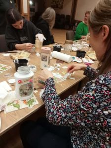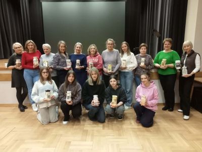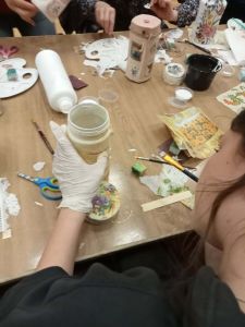 Podczas spotkania uczestnicy mieli okazję poznać technikę decoupage oraz samodzielnie wykonać ozdobne słoiki na kawę. Dzięki różnorodnym materiałom i inspiracjom powstały wyjątkowe prace – od klasycznych motywów kawowych, przez styl rustykalny, aż po bardziej nowoczesne kompozycje.