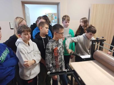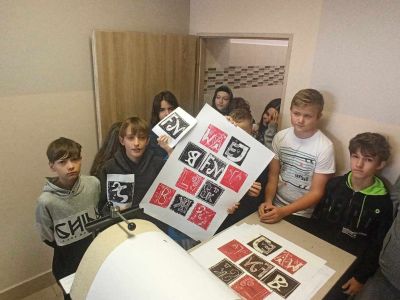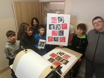 Młodzi ludzie dłutkami przygotowali sobie matryce przedstawiające inicjały każdego z nich, a następnie po nałożeniu farby, za pomocą manufaktury wykonali grafiki linorytowe.