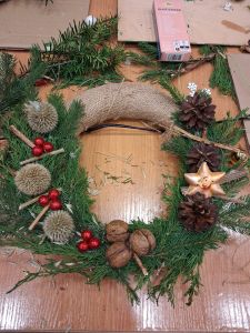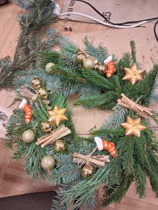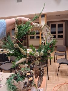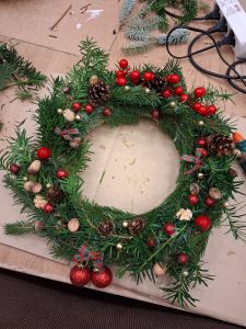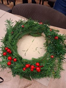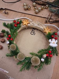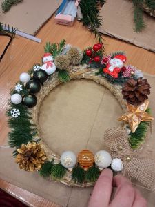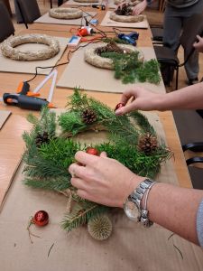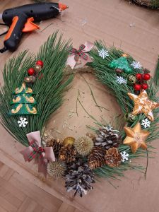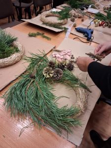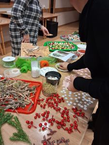 Podczas około dwugodzinnego spotkania uczestnicy mieli okazję własnoręcznie wykonać dekoracyjne wianki z wykorzystaniem różnorodnych materiałów oraz świątecznych ozdób. Zajęcia przebiegły w twórczej i przyjaznej atmosferze, a każdy z uczestników zakończył warsztaty z estetyczną, samodzielnie przygotowaną kompozycją.
