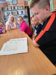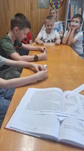 Następnie dzieci poznały kolejne dzieje książki – od starożytnych tabliczek glinianych i zwojów papirusowych, przez rękopisy średniowieczne, aż po współczesne książki drukowane. Dowiedziały się, jak na przestrzeni wieków zmieniała się forma książki oraz sposoby jej tworzenia i rozpowszechniania.
