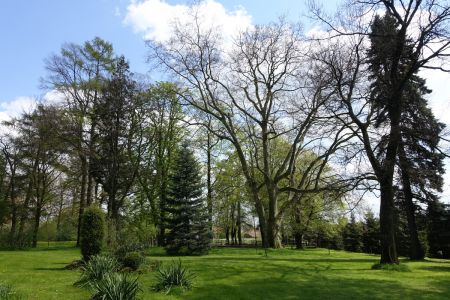 z II poł. XVIII w., w którego wschodniej części ulokowane były dwa stawy. W parku m.in. rośnie okazały platan.